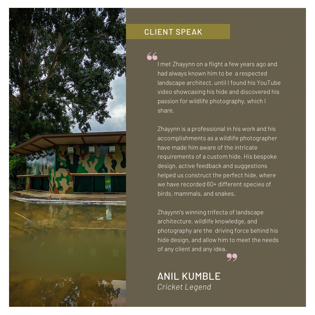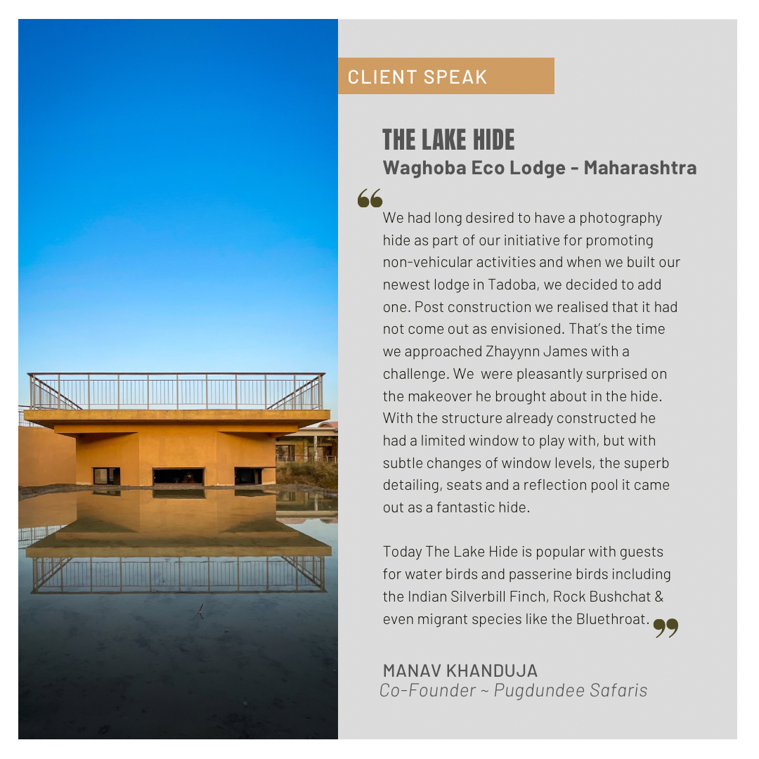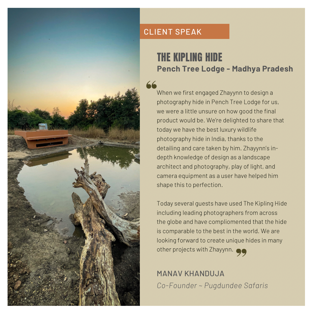 as my experience and requirements for photography, to create an environment for wildlife photography, keeping in mind the ecology and requirement of the wildlife, as well as the comfort, safety and ergonomics of the photographer(s). Whether you are an individual photography enthusiast, or a wildlife lodge seeking to create a unique experience for your guests, I will work with you to understand your requirement, study and document the species that are endemic to your environment and design a bespoke photography hide that would provide a platform for you or your guests to engage in an unparalleled photographic experience.